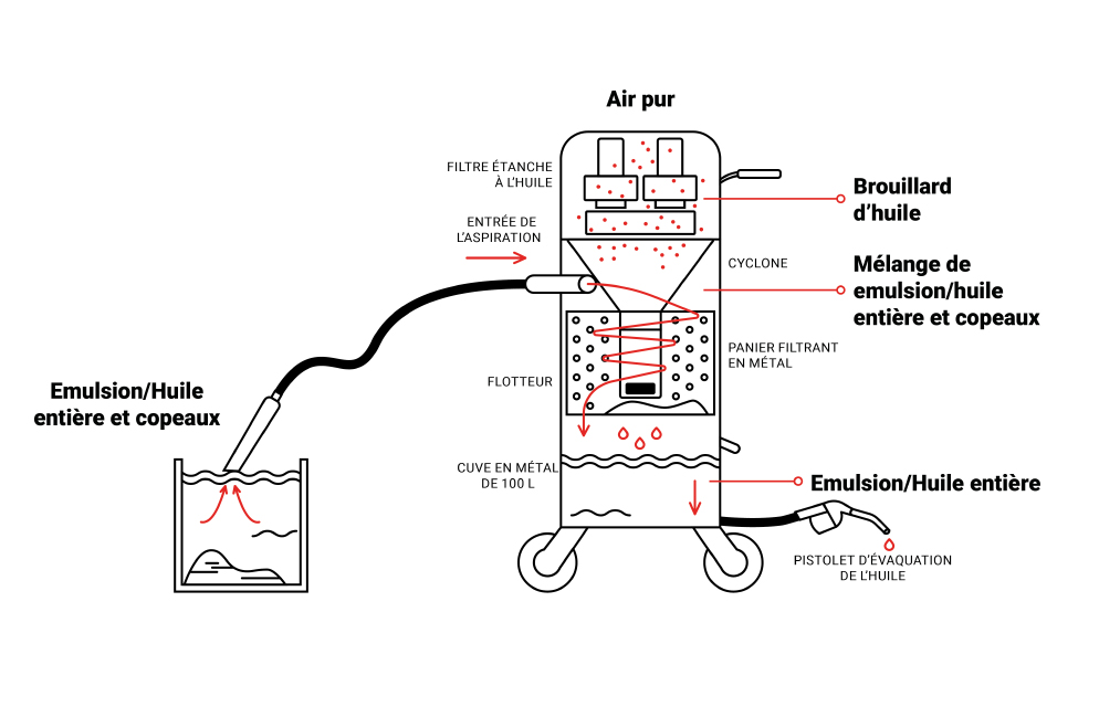 Le système « reverse flow » inverse le flux d’aspiration pour redistribuer le liquide lubrifiant réfrigérant filtré dans la machine-outil.