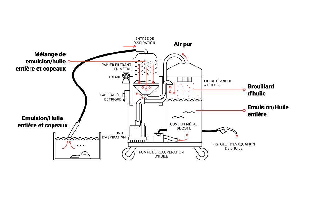 À l’aide d’une pompe de 60 lt/min pour l’évacuation des liquides filtrés, il permet en effet d’aspirer liquides et dépôts en évacuant simultanément les liquides émulsionnés filtrés.